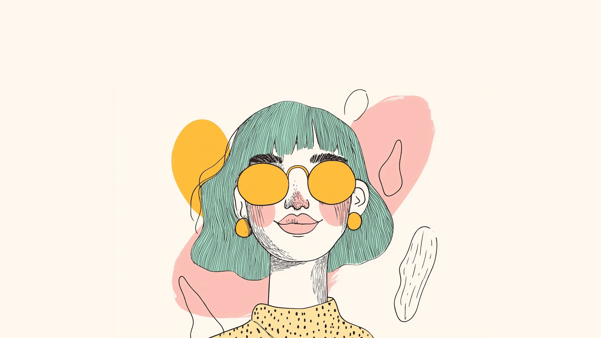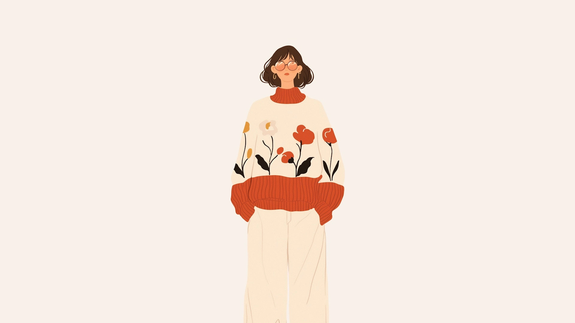 llustration of a person in a floral sweater, cream pants, and pink glasses, exuding a cozy, stylish vibe.