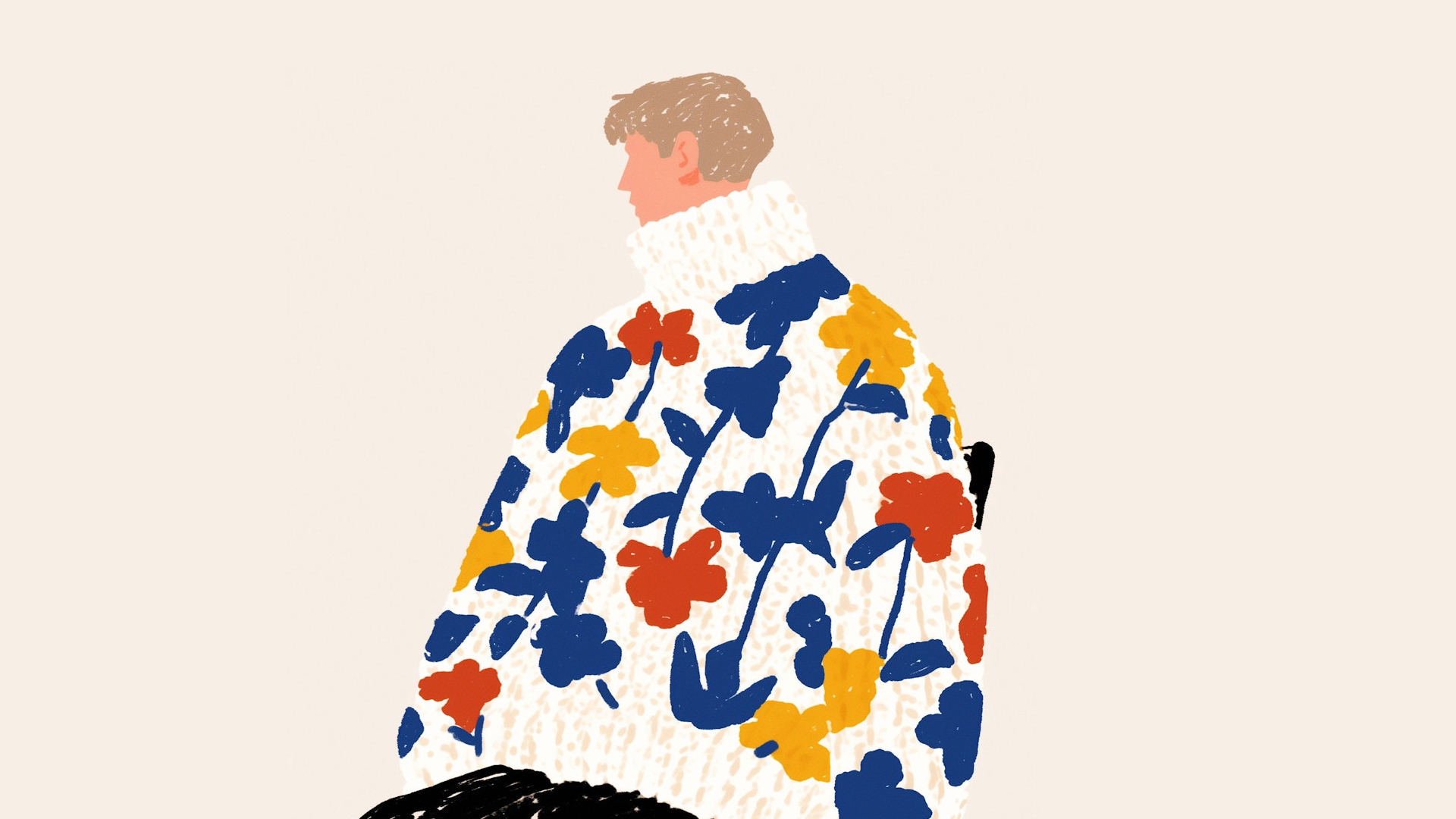 Stylized illustration of a person in a floral sweater with bold colors, sitting on a chair against a beige background.