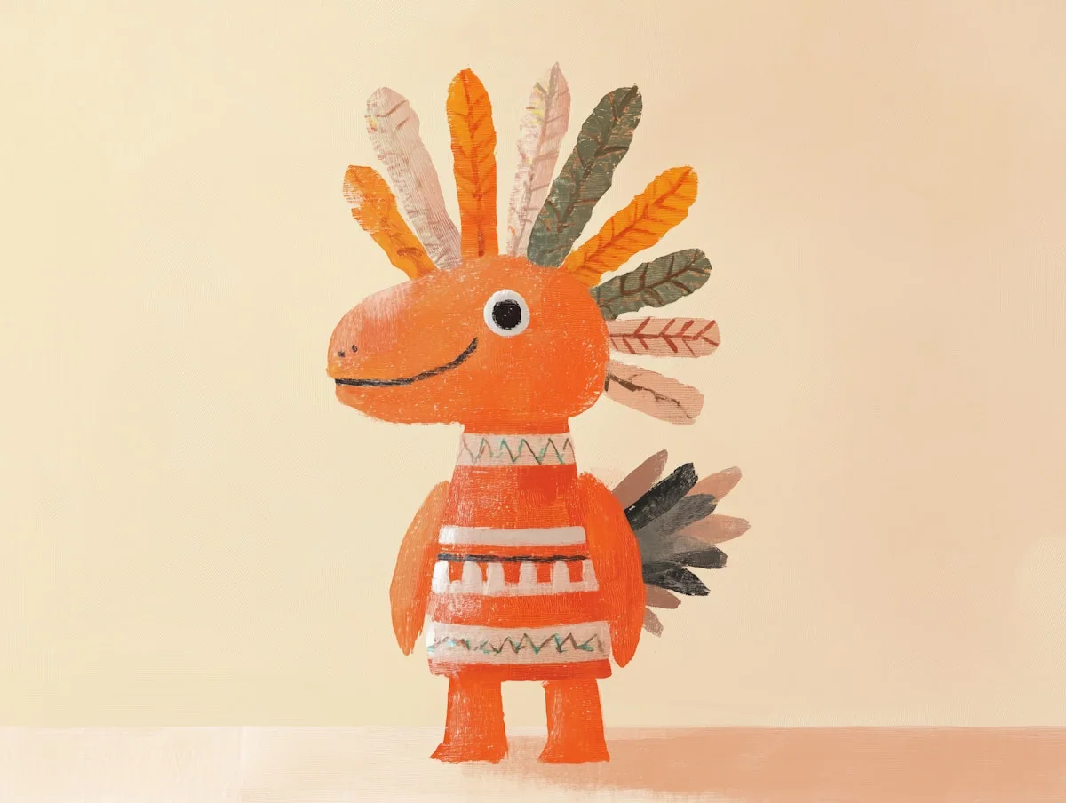 Whimsical orange creature with colorful feather headdress and patterned garment, set against a soft beige background.